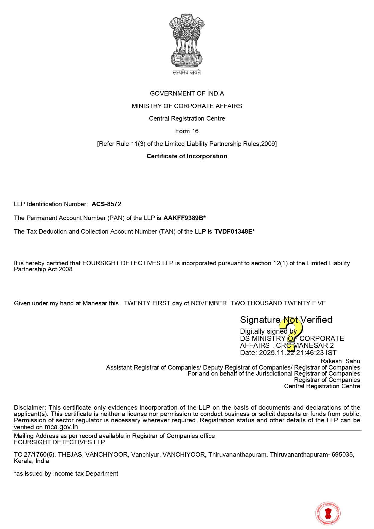 FOURSIGHT DETECTIVES LLP is a licensed private investigation and intelligence agency based in Trivandrum, Kerala, offering professional, discreet, and result-oriented detective services across India.